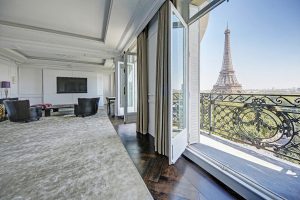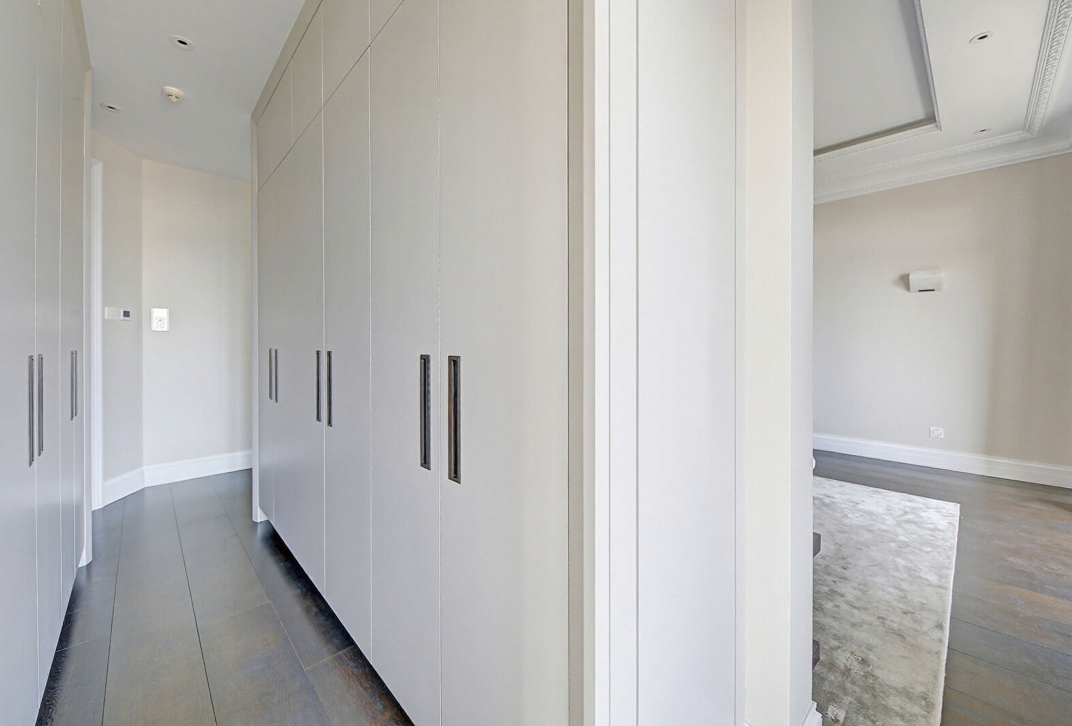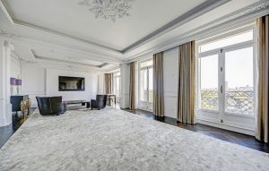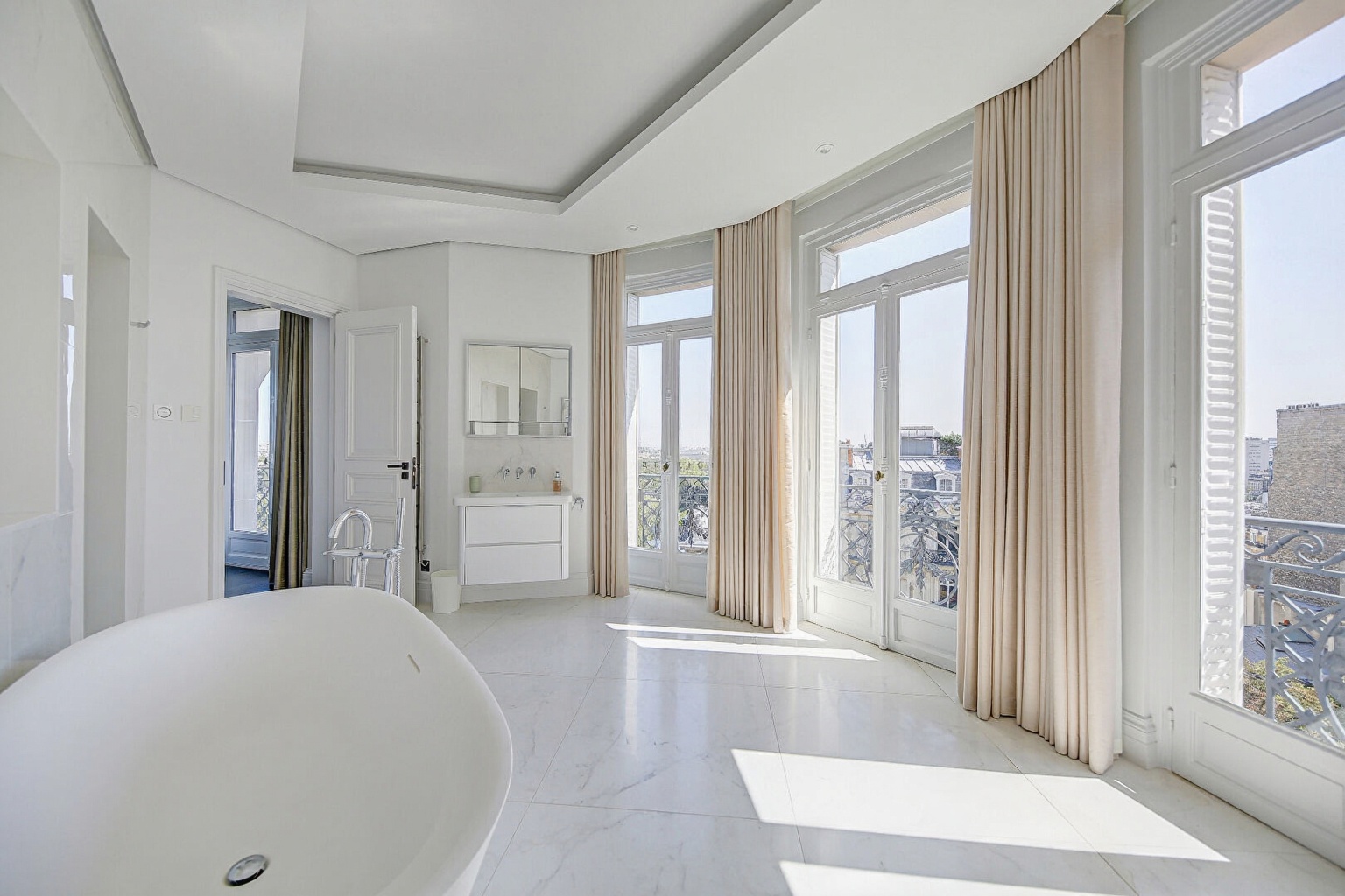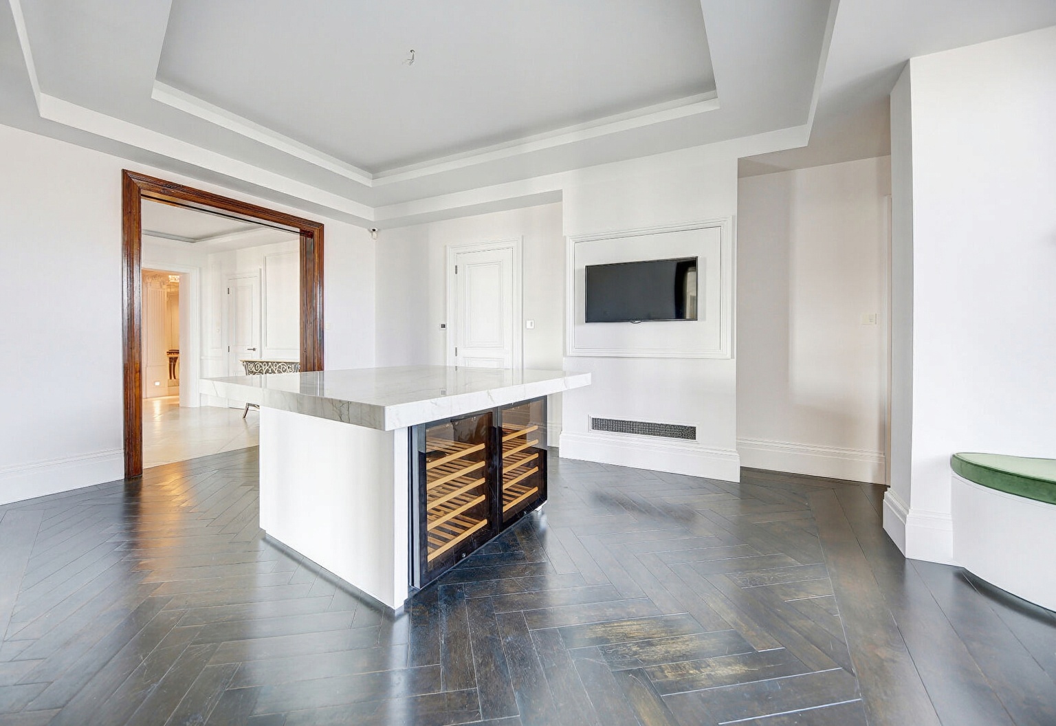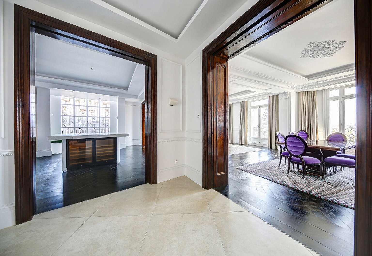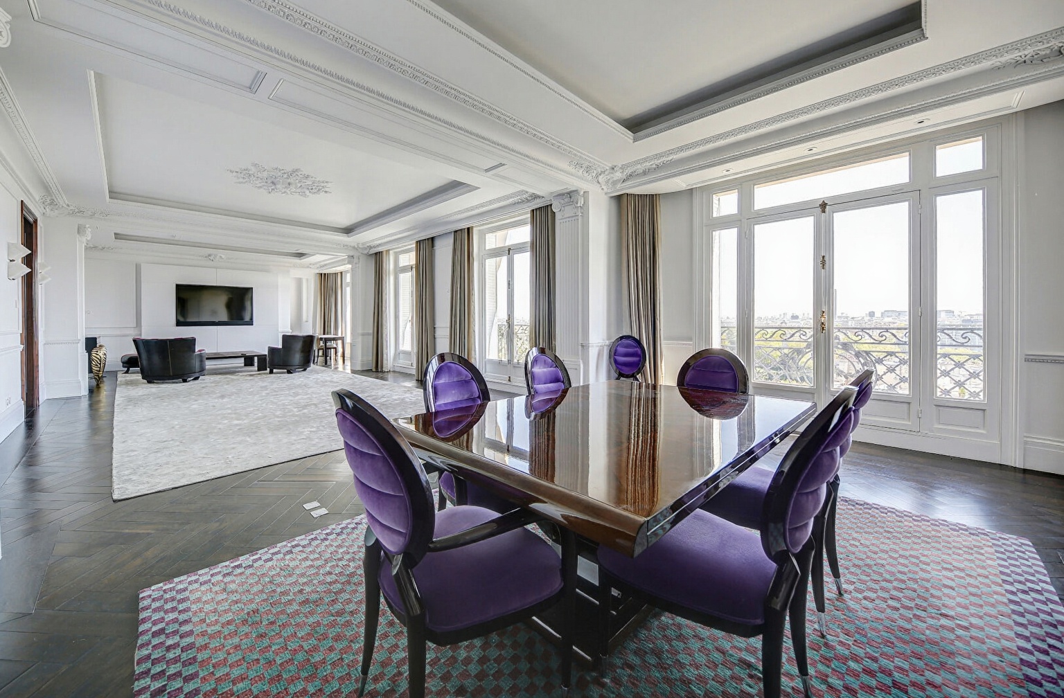 Trocadéro - Passy. In a superb Haussmannian building with elevator and concierge, this 290 sq m (3,145 sq ft) apartment offers a unique and exceptional view of the Eiffel Tower, the Seine, and the Trocadéro Gardens, with no overlooking neighbors. The apartment opens onto a beautiful entrance hall leading to a vestibule, a living room with a balcony and views of the Eiffel Tower, a dining room, a reception room with a central island and wine cellar, and a separate fitted and equipped kitchen. Three en suite bedrooms are available, including a master suite with a sublime Eiffel Tower view from the bed, spanning 40 sq m (430 sq ft), with a double dressing room and bathroom. The apartment is sold with three parking spaces. Condominium. Agency fees included, payable by the seller. Information on the risks to which this property is exposed is available on the Géorisques website: www.georisques.gouv.fr
