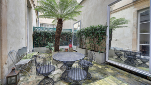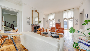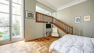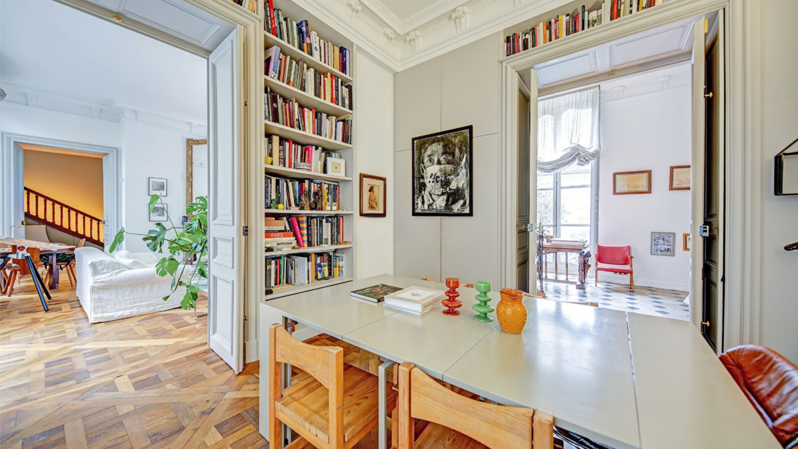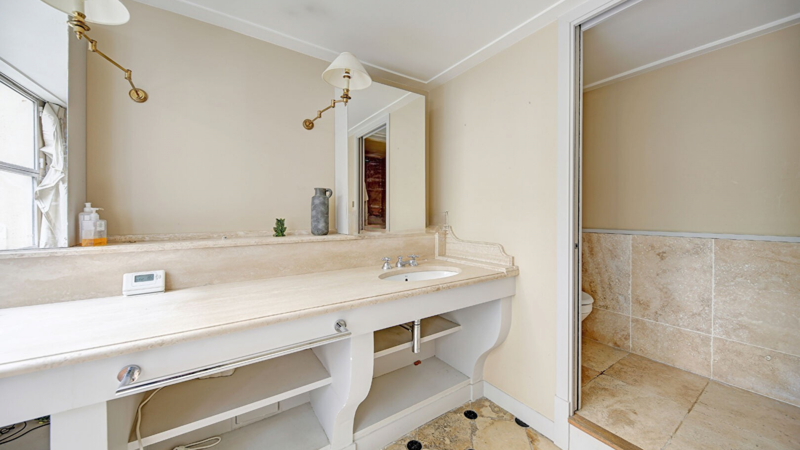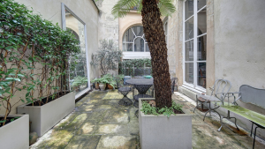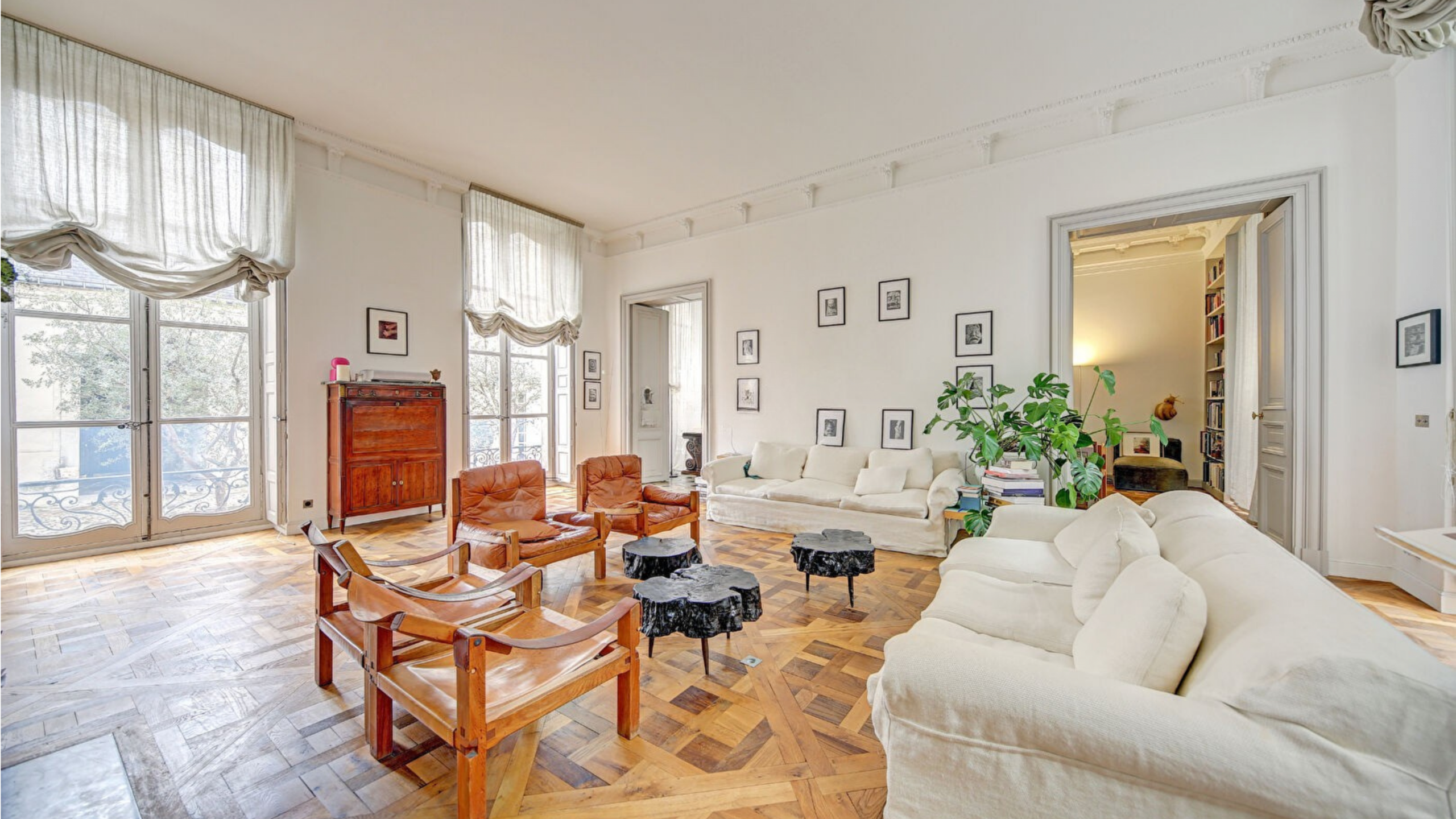 Marais district, Exceptional apartment in a historic mansion. Located in the heart of a prestigious district, this charming 225 sqm apartment (210 sqm Carrez), spread over two levels, has been completely restored by a renowned architect and designer. Crossing and bathed in light, it offers generous volumes with a ceiling height of 3.80 m. On one side, it opens onto a private landscaped courtyard of 34 sqm for exclusive use, and on the other, onto the main courtyard of a mansion. This rare and elegant property is composed as follows: On the raised ground floor (150 sqm Carrez): a welcoming entrance, a spacious living room of 47 sqm with direct access to the private courtyard, a dining room with kitchenette, connected to a separate kitchen via a freight elevator, also overlooking the private courtyard, a large bedroom of 23 sqm, with access to the private courtyard, including a mezzanine office and a shower room with WC, a second bedroom with its shower room and WC, overlooking the main courtyard and numerous custom-made storage spaces (dressing room and bookcases). In the converted basement (60 sqm Carrez): a TV lounge of 34 sqm, ideal for a sports or relaxation area, a laundry room, an office, a shower with WC and an additional kitchen. This property with its Versailles parquet flooring, fireplaces and carefully restored period paving, in a rare and refined living environment, combining the charm of the old and modern comfort is an invitation to a unique art of living. Sellers' charges schedule. Information on the risks to which this property is exposed is available on the Géorisques website: www.georisques.gouv.fr Property in co-ownership of lots.